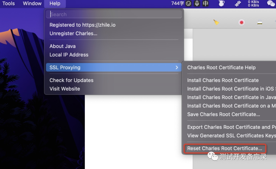 如上图所示,可以在help -> SSL Proxying->Reset Charles Root Certificate... 来重置证书链接。这样的方式比重新下载证书再次安装会好。因为如果不重置,可能重新下载的一直是过期证书,不好解决问题。