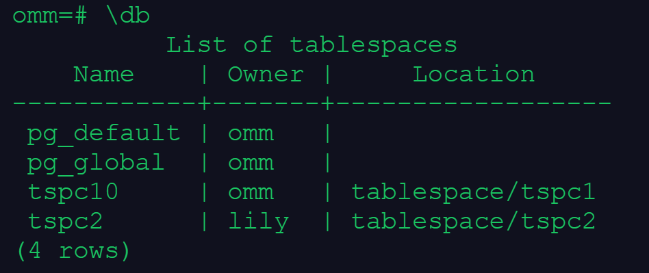 3.重命名tspc1,修改tspc2的用户为Lily,使用\db查看表空间信息