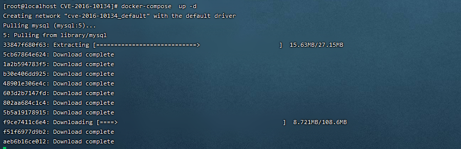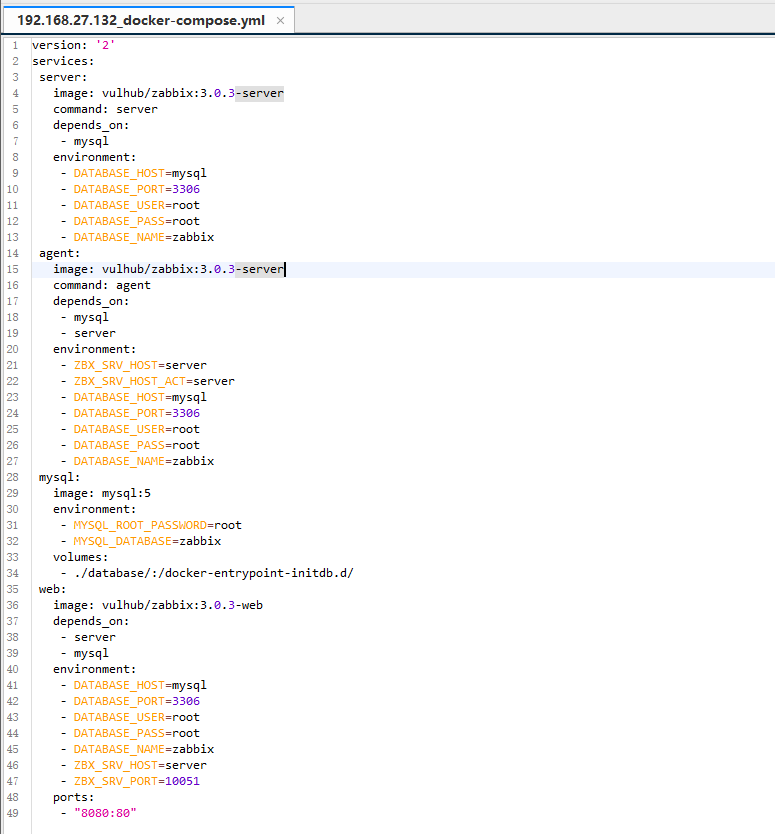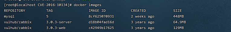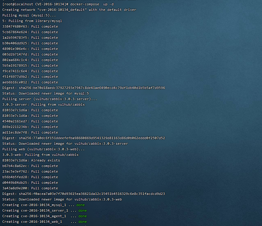 以Vulhub中zabbix/CVE-2016-10134项目为例,进入该路径下,发现docker-compose.yml文件,在上述对docker-compose.yml介绍中我们便是使用了该项目的docker-compose.yml文件作为举例,从分析可知,该项目需要拉取3个镜像,启动3个服务。