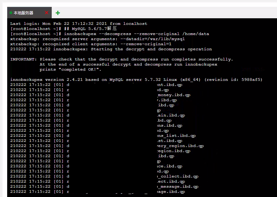## 解包cat <数据备份文件名> | xbstream -x -v -C /home/mysql/data## MySQL 5.6/5.7解压innobackupex --decompress --remove-original /home/mysql/data## MySQL 8.0解压xtrabackup --decompress --remove-original --target-dir=/home/mysql/data