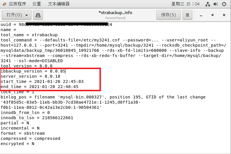 经过2次解包后,已经可以恢复正常的文件结构。在解压后的文件中找到xtrabackup_info文件,可以找到原始mysql版本,以及压缩使用的xtrabackup版本,user,备份时间等信息。