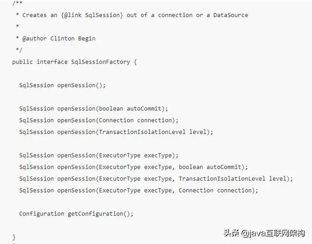 但 SqlSessionFactory 是一个接口,它里面其实就两个方法:openSession、getConfiguration