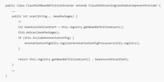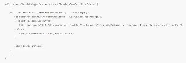 ClassPathMapperScanner 继承自 Spring 中的类ClassPathBeanDefinitionScanner,所以它的 scan 方法会调用到父类 ClassPathBeanDefinitionScanner 的 scan 方法,