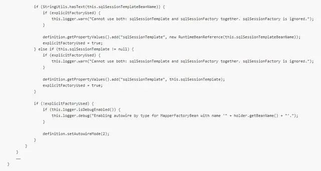 设置 BeanDefinition 对象的 BeanClass 为 MapperFactoryBean<?> 。这就相当于使用 MemberMapper 注册时:当前的 mapper 接口在 Spring 容器中,beanName 是 memberMapper,beanClass 是 MapperFactoryBean.class。故在Spring 的 IOC 初始化的时候,实例化的对象就是 MapperFactoryBean 对象。