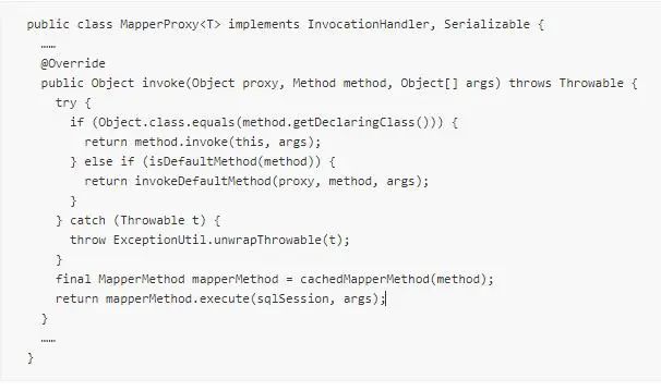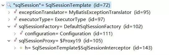 最终在 setSqlSessionFactory 这个方法里,sqlSession 获取到的是 SqlSessionTemplate 实例。而在 SqlSessionTemplate 对象中,主要包含sqlSessionFactory 和 sqlSessionProxy,而 sqlSessionProxy 实际上是 SqlSession 接口的代理对象。实际调用的是代理类的 invoke 方法。