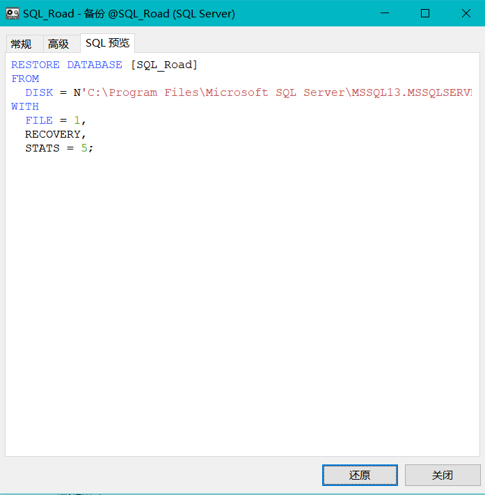 点击生成SQL就会看到执行备份的SQL命令,点击还原即可开始执行