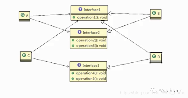 类 A 通过接口 Interface1 依赖类B,类C 通过接口 Interface1 依赖类D,如果接口 Interface1 对于类A 和 类 C来说不是最小的接口,那么类B 和 类 D 必须去实现他们不需要的方法