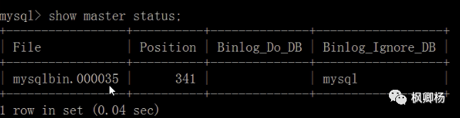 执行完此步骤后不要再操作主服务器MYSQL,防止主服务器状态值发生变化。