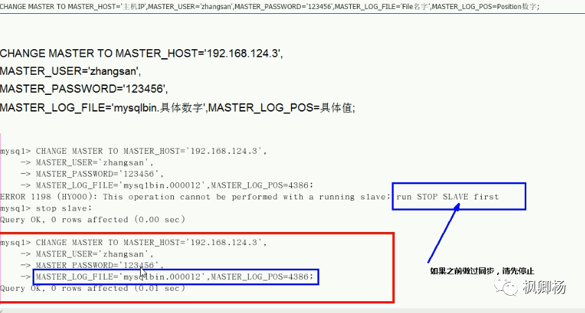 出现上述的错误以后,我们可以先停止同步,再做相应的配置。如果重新配的话,这里要重新输入show master status重新进行判断。