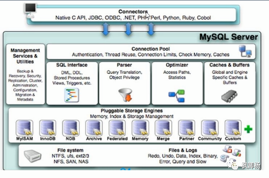 最上层是一些客户端和连接服务,包含本地sock通信和大多数基于客户端/服务端工具实现的类似tcp/IP的通信。主要完成一些类似于连接处理、授权认证、及相关的安全方案。在该层上引入了线程池的概念,为通过认证安全接入的客户端提供线程。同样在该层上可以实现基于SSL的安全链接。服务器也会为安全接入的每个客户端验证它所具有的操作权限。