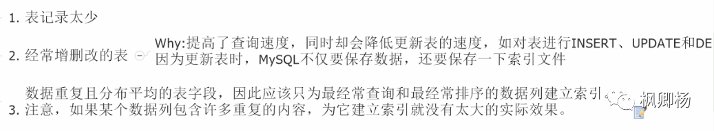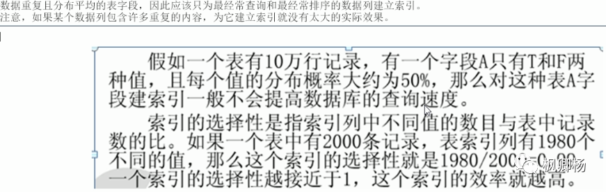 2.索引会提高查询速度,会降低更新表的速度,如对表进行INSERT、UPDATE和DELETE,在我们更新表的时候,一方面要保存数据,还要保存索引文件每次更新添加了索引列的字段,都会因为调整因为更新带来的键值变化后的索引信息
