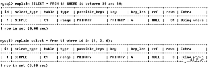 只检索给定范围的行,使用一个索引来选择行。Key列显示使用了哪个索引