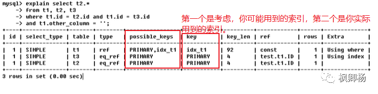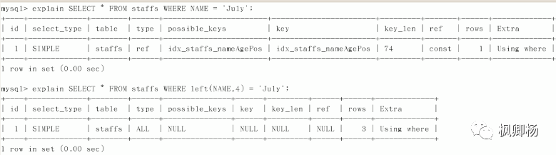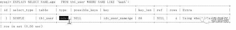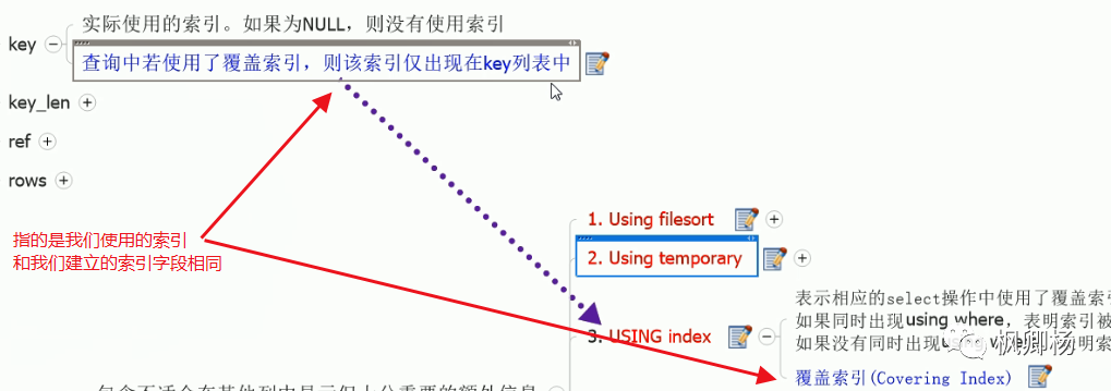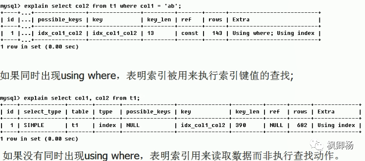 如果同时出现using where,表明索引被用来执行索引键值的查找
