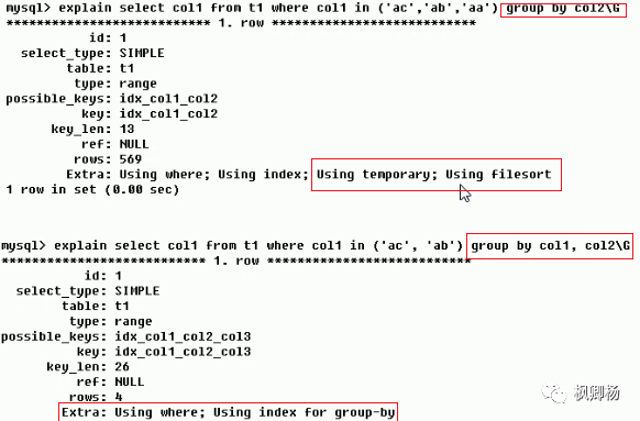 注意点:在用到group by的时候,这里进行分组的时候,最好和索引的顺序相同,保证用到索引,不产生“文件排序”,以及using tempory 临时表的产生。