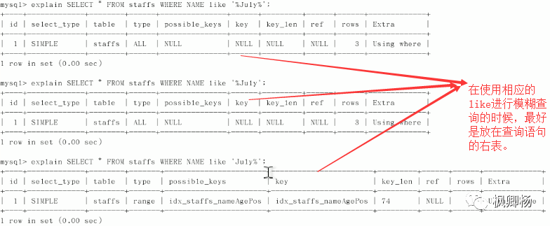 #注意点:varchar类型,在做数据查询的时候,记得一定要带单引号,因为在不带单引号的情况下,会对其中的类型进行一次类型转换,有违背上面所说的,第三条:不要再索引上做任何的计算,类型转化等等,再数据量过大的时候,查询效率会大大的下降。