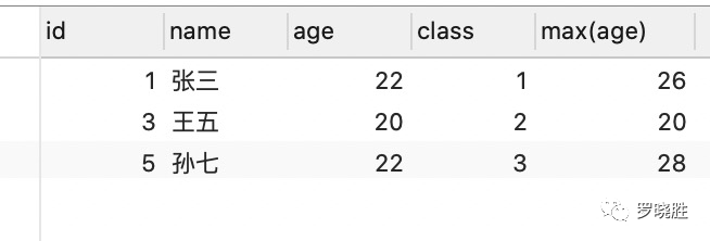 SELECT*FROM studentWHERE age in(select max(age) Max_age FROM student GROUP BY `class`)GROUP BY`class`;