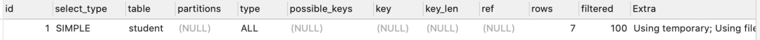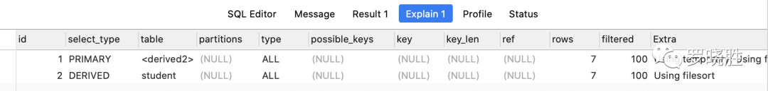 分析:通过 explain 查看执行计划,可以看到 使用having 1,也会使用 DERIVED(得到) 操作。