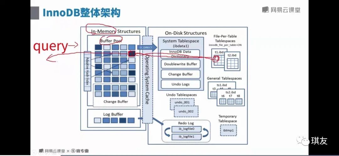 查询修改流程:查询ID为1这条数据,先查看bufferpoll内存空间是否有数据,有数据直接返回,没有去磁盘读取数据,加载到内存中去。下一次读取直接去内存中去读取。