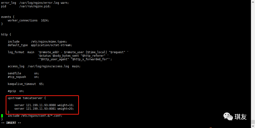 docker cp 容器名:我们找到的配置文件路径 本地路径docker cp nginx-test:/etc/nginx/nginx.conf nginx.conf添加一个 upstream 自己取名 {server ip1 权重;server ip2 权重;}