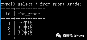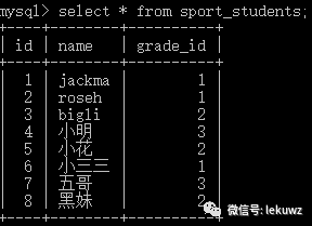 jackma的grade_id=1,对应第一张表中的id=1,是七年级