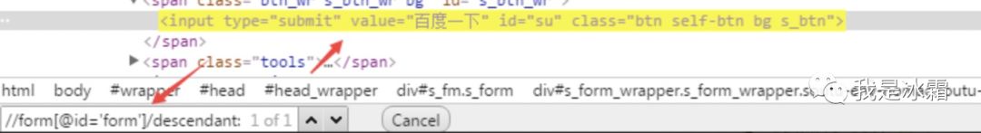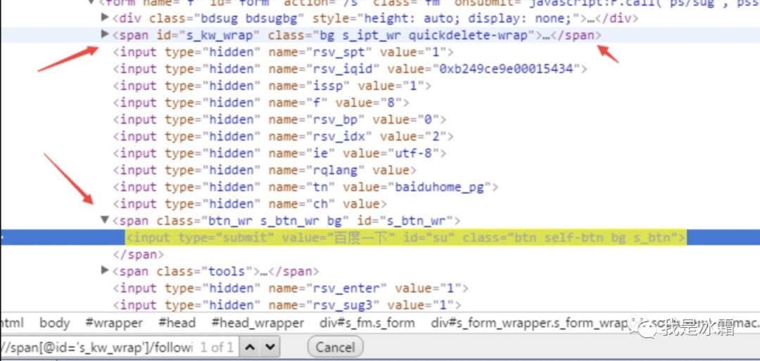 xpath= "//span[@id='s_kw_wrap']/following::input[@id='su']"//span[@id='s_kw_wrap']表示定位到id属性为s_kw_wrap的<span>标签,/following::input[@id='su']表示找到<span>结束标签(即</span>)后的所有input标签,然后通过[@id='su']精准定位到id属性为'su'的<input>标签