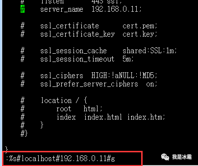 移动至行尾:【Shift】+$(对应键盘上的数字4上面的符号)(5)vi模式下批量修改一个文件中的字符串(比如把一个配置文件中的一个ip改为另一个ip)文件内全部替换:首先vi打开一个文件,然后使用如下命令:%s#localhost#192.168.0.11#g (如文件内有#,可用/替换,:%s/localhost/192.168.0.11/g)
