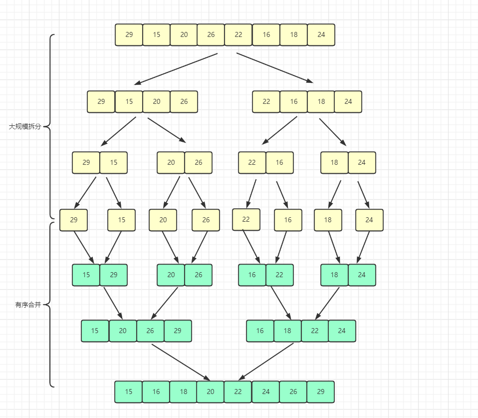 然后向上合并,合并的新规模也是有序的,直到合并至原规模大小,此时数组已有序。