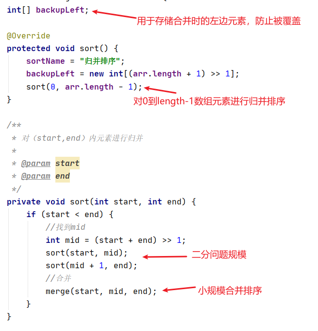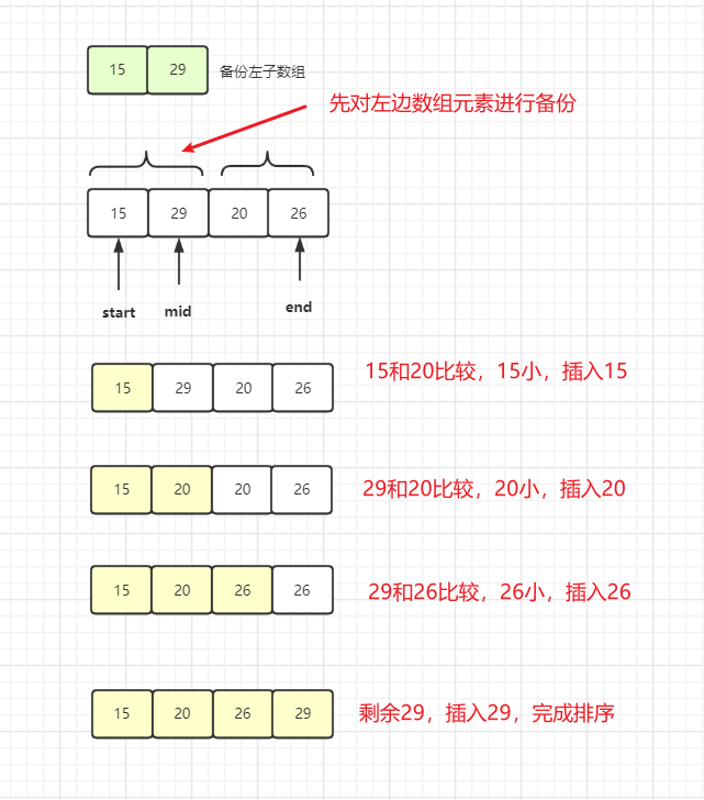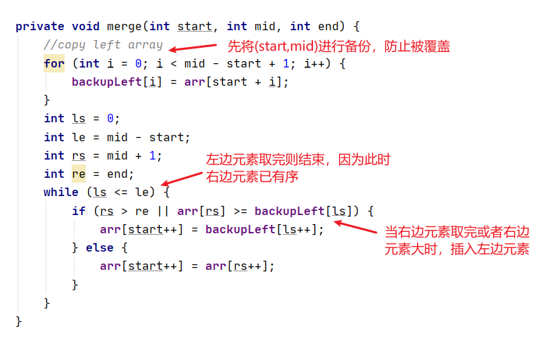 先进行左子数组的备份,因为后面进行比较时,都将数组从左开始填充。