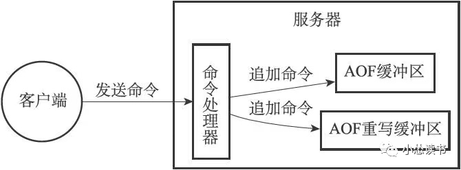 Redis设置一个AOF重写缓冲区,在服务器创建这个子进程时开始使用,当Redis服务器执行完一个写命令后,它会同时将这个写命令发送给AOF缓冲区和AOF重写缓冲区,如下: