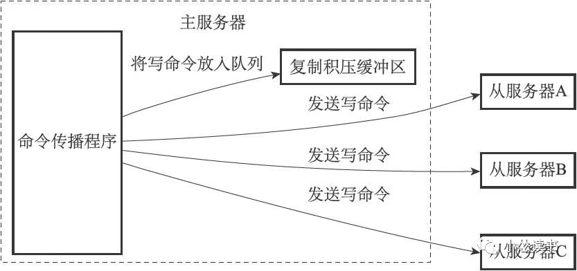 主服务器进行命令传播时,不仅将写命令发给所有从服务器,还将写命令入队到复制积压缓冲区,如下: