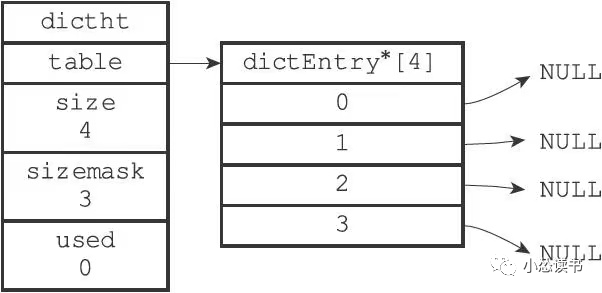 typedef struct dicht {// 数组dictEntry **table;// lengthunsigned long size;// 掩码,用于计算索引值,=size-1unsigned long sizemask;// 哈希表已有节点数量unsigned long used;}