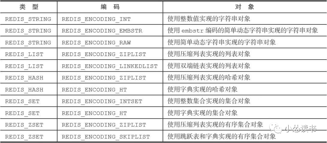 编码:记录对象使用的编码,即这个对象的底层实现数据结构,如下。