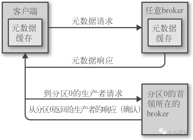 客户端发送一种元数据请求,请求包含客户端感兴趣的主题列表。服务端响应信息指明这些主题包含的分区、分区的副本以及首领副本是哪个。元数据请求可以发送任意broker(都存了这些信息),客户端就需要时不时的刷新这部分数据,比如在新broker加入、副本移动等这些变化要感知到。