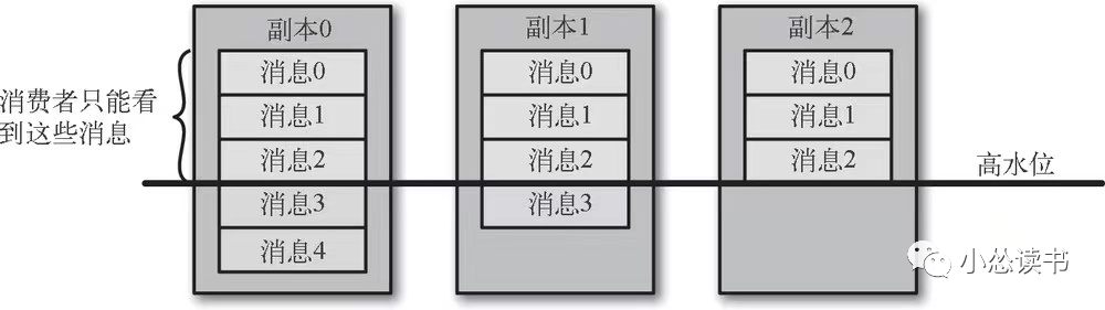 客户端只能读取已经被写入到所有同步副本的消息,没有写到所有同步副本的数据不会返给消费者。因为Kafka认为这种情况是不安全的,如果主分区发生奔溃,另一个同步副本晋升后消息会丢失。如下图所示。