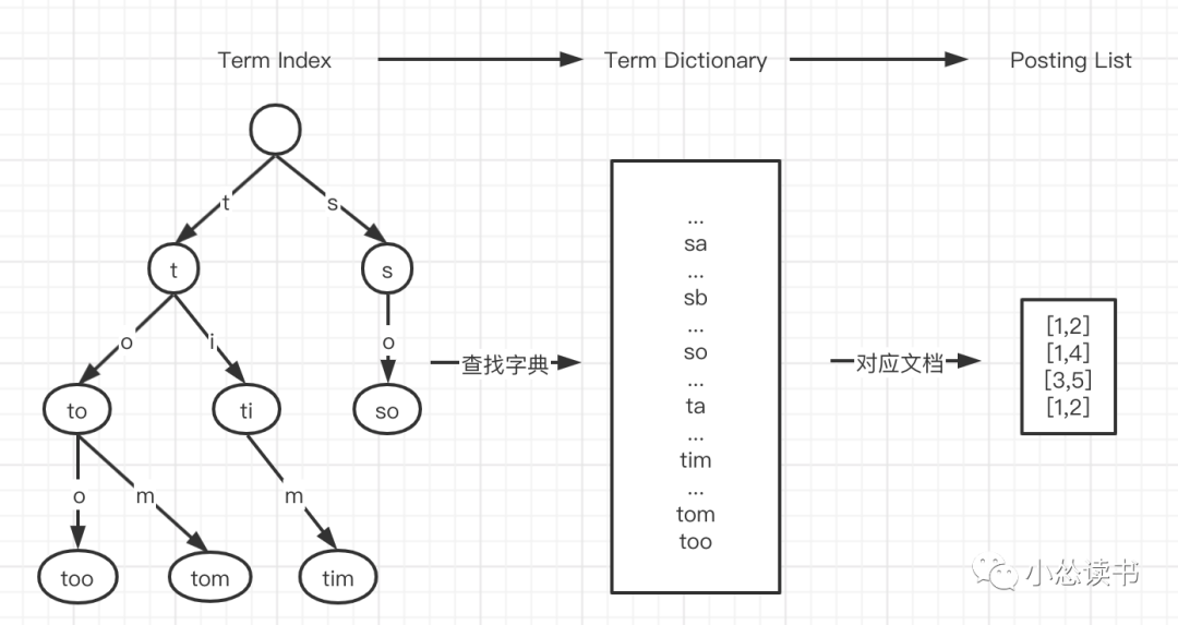 词项(term)太多如何存储,在ES中将所有的词项通过字典顺序排列好后存储起来,这个数据结构叫词项字典(Term Directory)。实际业务中每一个词项并不只存在一个文档中,而是关联一个文档id的列表,ES中称为Posting List(关联文档ID的列表)。