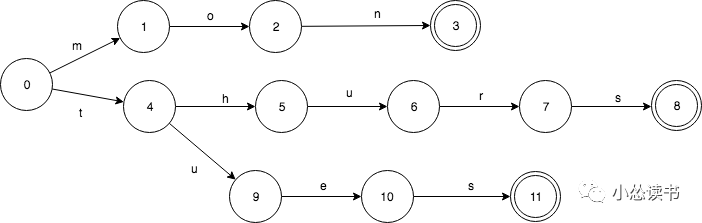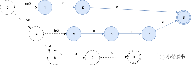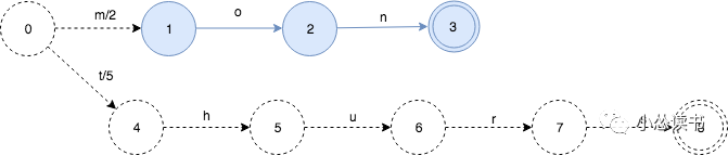 由于mon和thurs没有共同的前缀,只是简单的2个map中的key. 所以他们的output value可以直接放置在start状态的第1个转移上。