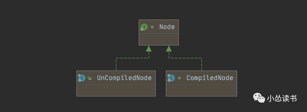Node(节点)、Arc(弧、边):Node之间使用一个Arc连接,一个Node跟一个或多个Node连接。Node还具有两种状态:UnCompiledNode和CompiledNode。在源码中,使用两个对象来描述这两种状态,如下所示: