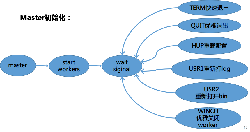 Master 进程:监视工作进程的状态;当工作进程死掉后重启一个新的;处理信号和通知工作进程。