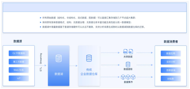 这是传统数据湖的数据处理流程,不同数据源和各种类型的数据先汇总至数据湖,再到数据仓库。这是搭建传统数据湖后很常见的湖仓割裂的情形。