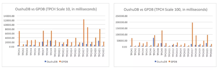 OushuDB基于SIMD的新执行器,在国际标准测试数据集TPCH上的测试结果表明,OushuDB比Greenplum大约快5-10倍,比SparkSQL
