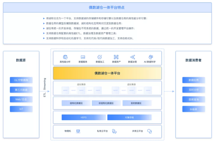 偶数湖仓一体方案通过可插拔存储和虛拟计算集群打通数据湖和数据仓库。结合底层大数据存算分离架构,实现全量数据统一存储;通过统一元数据实现全量数据的视图统一;上层提供SQL接口实现接口统一,并极大地降低了大数据使用的难度。