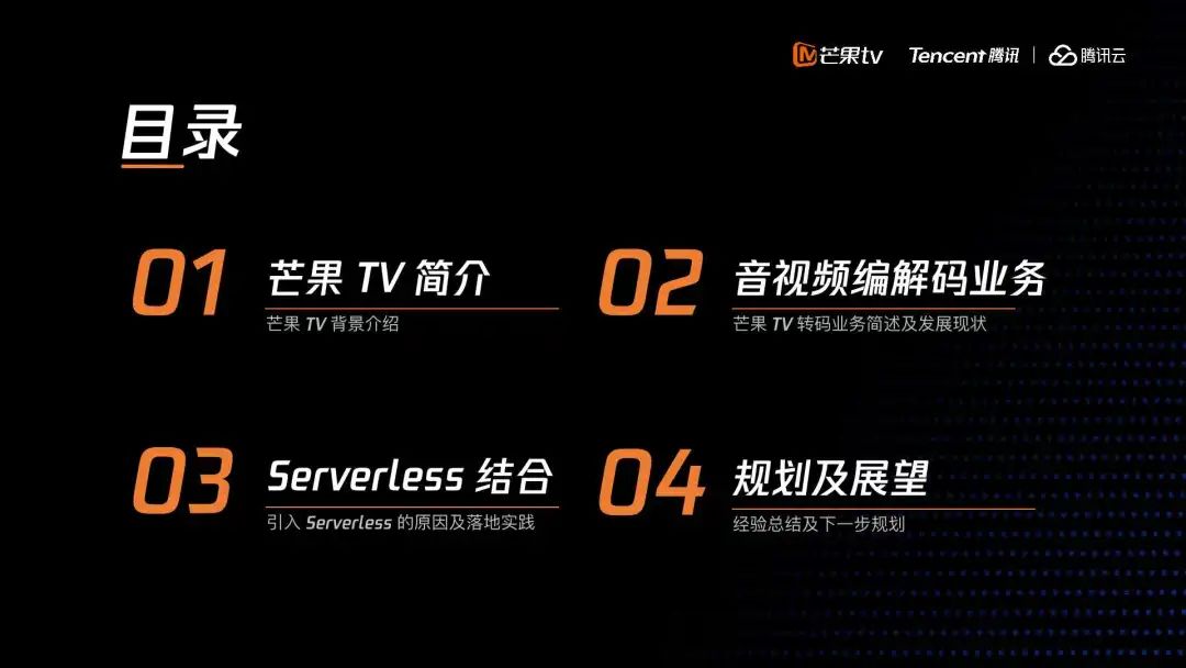我本次的分享主要分四个部分,第一个是芒果TV简单介绍;第二个是音视频编解码业务的简述及发展现状;第三是引入Serverless结合以后,我们在此期间做的事情;第四是规划及展望。