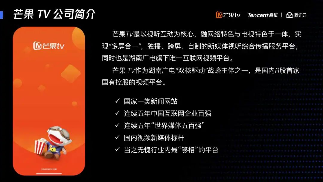 芒果 TV 作为湖南广电双核驱动的战略主体之一,是国内 A 股首家国有控股的视频平台。经过这么多年的发展,获得非常多的荣耀。