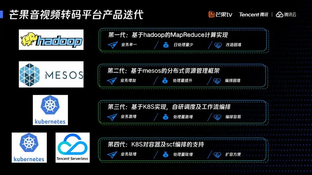 第二代,是基于mesos的分布式资源管理框架,这个时候我们的业务已经有所增加,日处理量得到提升,尤其是 2016 年芒果提出独播的战略,音视频内容需要快速生产上线,在此基础上实现了视频分段转码。