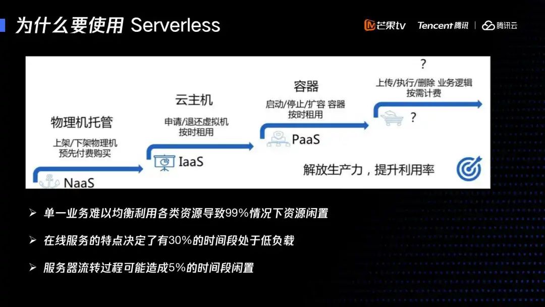 早期的物理机和云主机和容器的特点,决定了30%的时间是处于低负载的情况。而芒果早期视频的转码,大概有上百台服务器,在本地IDC机房。白天资源严重不足,但到凌晨则处于低负载,服务器资源无法合理使用,而如今采用 Serverless 以后,能够保证我们资源得到合理利用。