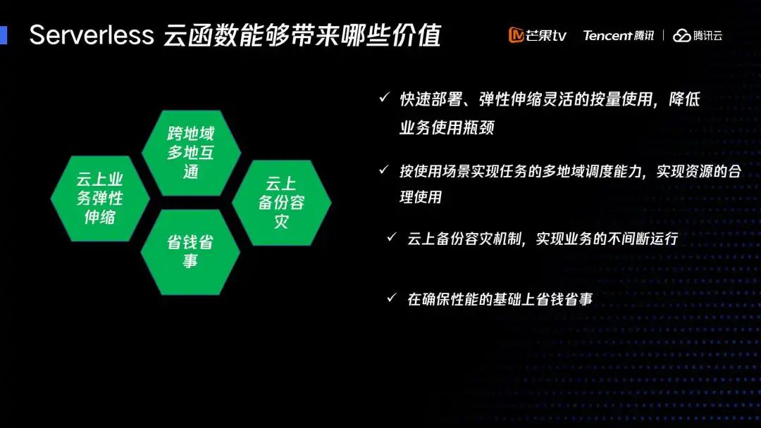 我们考虑视频处理的场景非常消耗资源,用户一次请求需要消耗 4 个核心 CPU,64 核传统的服务器,同时能够处理16个用户的请求,如果我们 QPS 达到 100 的时候,需要大量的服务器去支撑,而在采用SCF后,这是目前我们做的收益非常大的一个面。