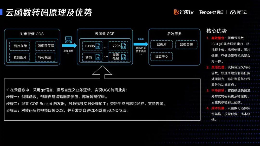 它的核心优势主要是在于凭借云函数强大的联动能力,能够将我们视频上传以及视频处理和加工,还有视频提取还有存储场景能够有机结合为一体。