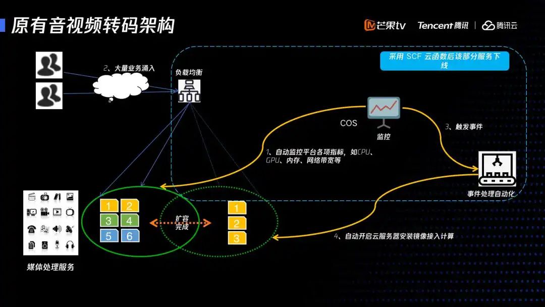 我们原有的音视频转码架构,需要自己监控各项指标,比如说 CPU 和内存,还有网络带宽。我们通过触发器,去调动云服务器的安装镜像去接入计算平台,这个有一个比较大的问题,它这里延时比较高。