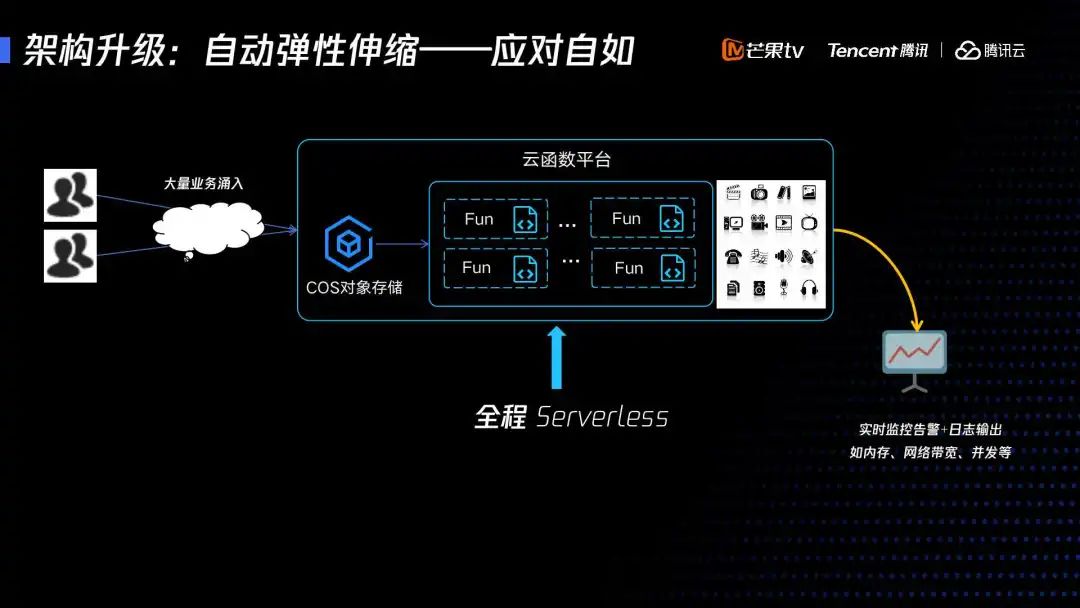第二,我们启动以后,什么时候释放资源也存在很大的问题,造成大量计算资源的浪费。而所以采用 SCF 以后,就可以运用云函数自动扩容的方式去应对大量用户请求,同时腾讯云实现了实时监控,比如说内存、并发,网络带宽。