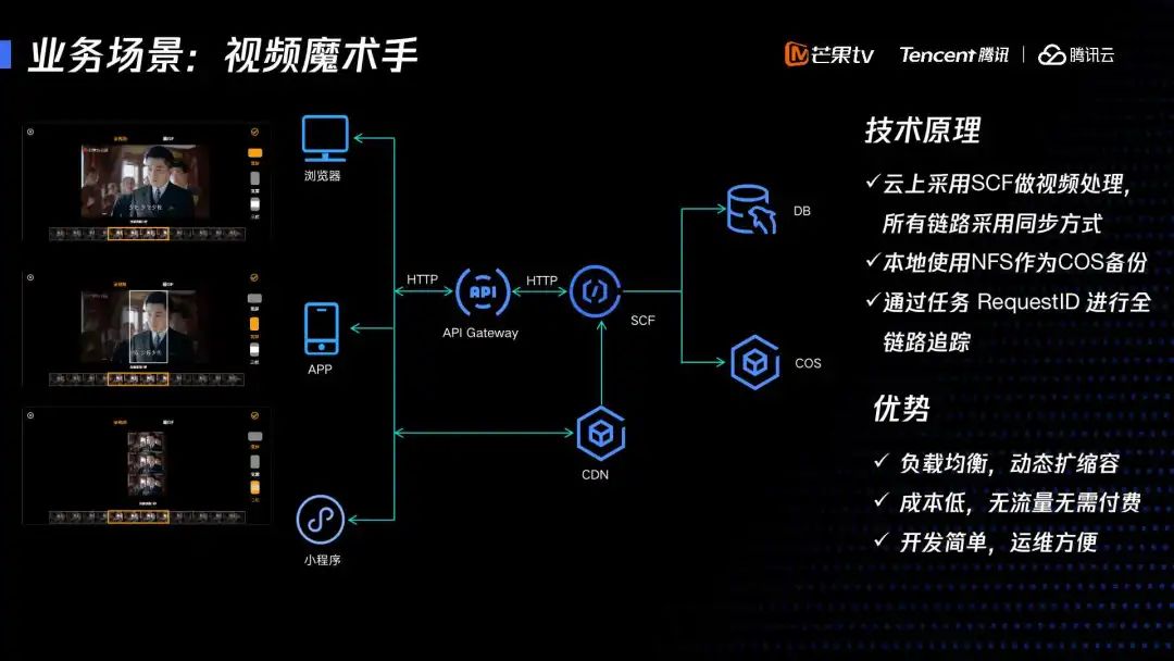 我们在调研的过程当中发现,在客户端实现的时候,考虑用户设备的计算资源,还有他可能有一个弱网环境下,导致内容上传出现问题,因此我们从服务端去实现,采用云函数SCF处理来解决。客户端、浏览器或者是 APP 小程序请求生成片段时,利用 SCF 处理后将视频地址返回给用户播放,再分享出去。传统服务端实现需要考虑负载均衡,但是这次我们采用 SCF 后能够动态去扩缩容,成本低,而且用户没有任何请求的时候,不要支付费用任何费用。